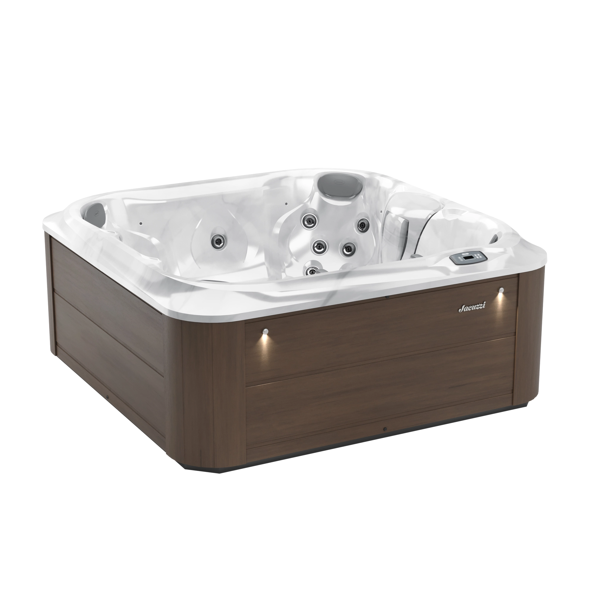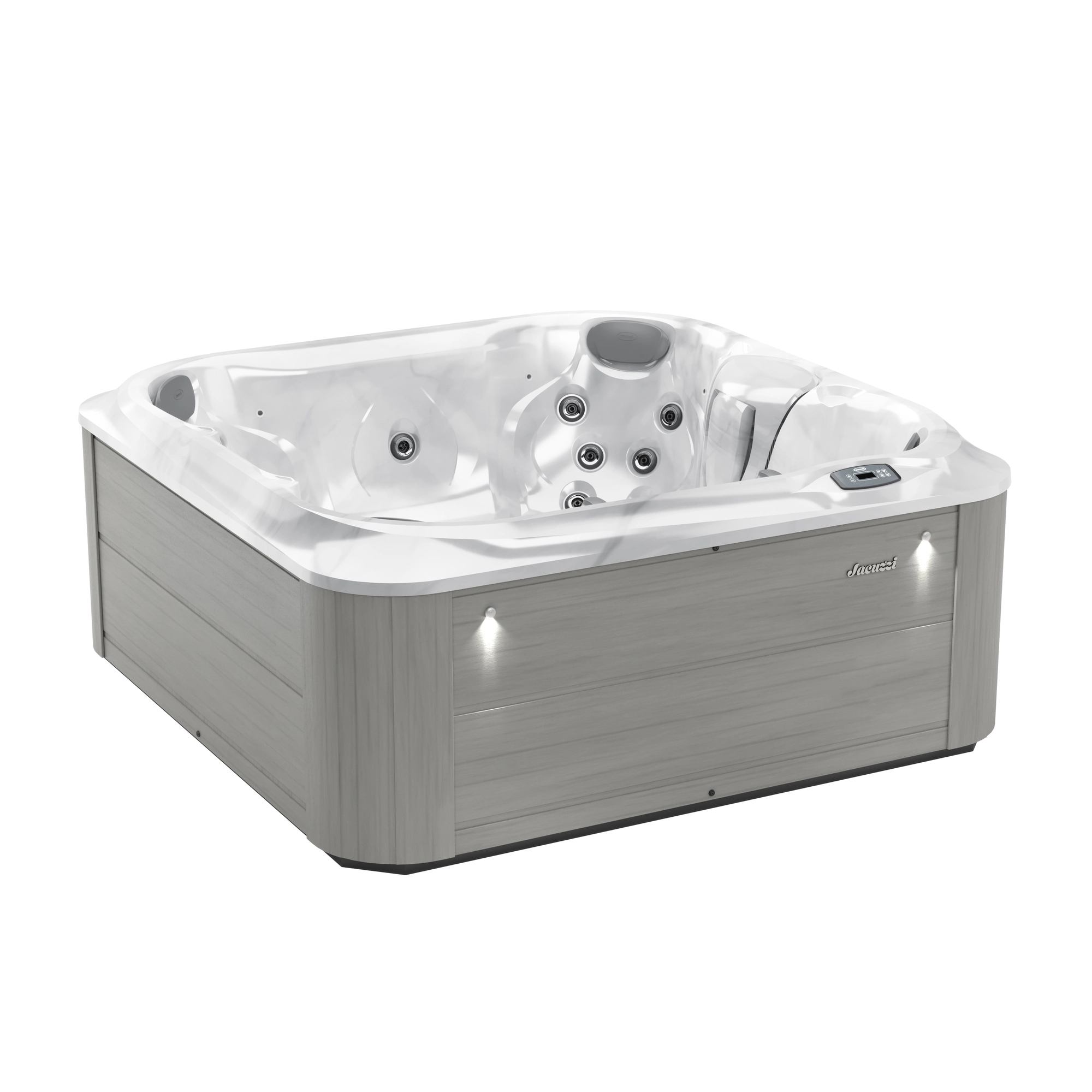Jacuzzi J-225 to kwadratowa wanna spa o wymiarach 203 × 203 cm i wysokości 84 cm. Oferuje 4 do 5 miejsc siedzących, z czego cztery to dedykowane fotele terapeutyczne z zagłówkami oraz różnymi konfiguracjami dysz. Siedziska zostały rozmieszczone tak, aby zapewnić maksymalną wygodę użytkownikom niezależnie od wybranego miejsca. Uzupełnieniem komfortu są podświetlane zagłówki oraz uchwyty na kubki, które uprzyjemniają korzystanie z wanny także po zmroku.