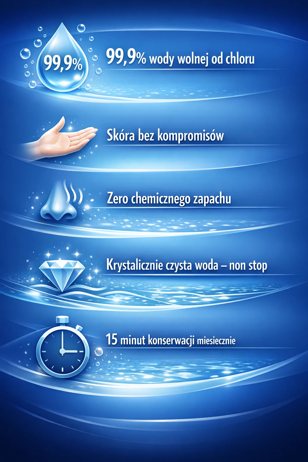 Mniej chloru niż w wodzie pitnej z kranu. Żadnego bromu, żadnej dezynfekcji solnej jako podstawy systemu.